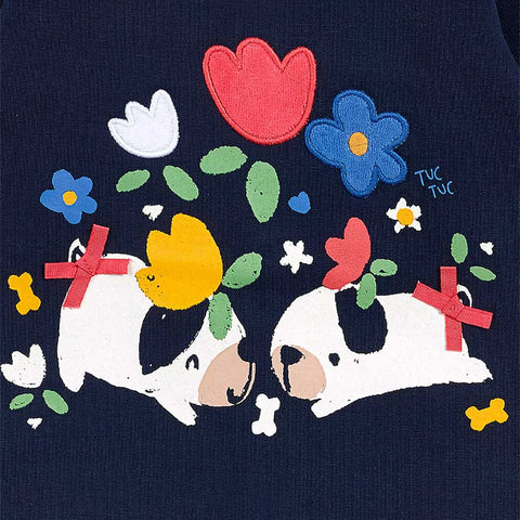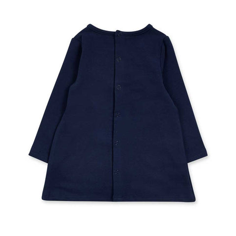 Abitino della Linea Abbigliamento Bambina Tuc Tuc, con stampa sul davanti ed applicazione in tessuto. Abbottonato sul dietro con bottoncini a pressione.