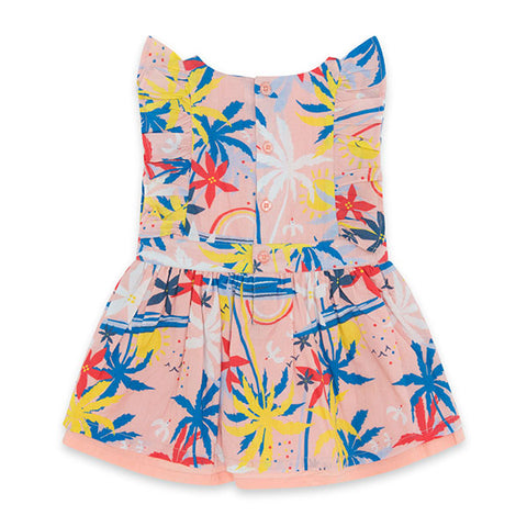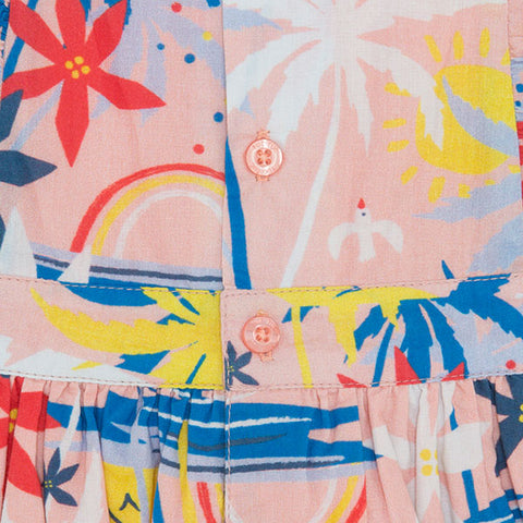 Abitino della Linea Abbigliamento Bambina Tuc Tuc, collezione enjoy the sun, con fantasia tropicale su fondo rosa. Gonna ampia con sottogonna. Taglio sui fianchi e bottoncini sul dietro.