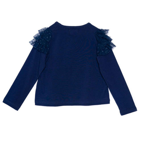 T-shirt girocollo della Linea Abbigliamento Bambina Rosalita Senoritas in cotone con maniche lunghe. Navy con Rosalita ricamata e dettagli in strass. Dettaglio volant con plumetis navy sulle spalle.
