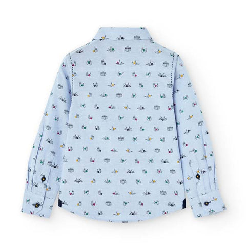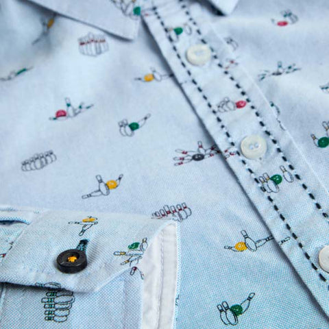 Camicia della Linea Abbigliamento Bambino Boboli, in tessuto oxford e fantasia con piccole miniature di birilli.