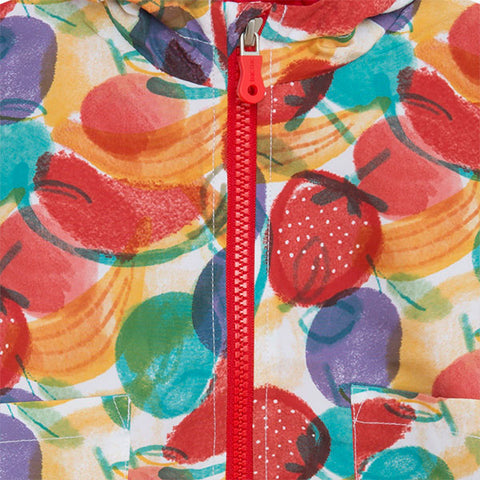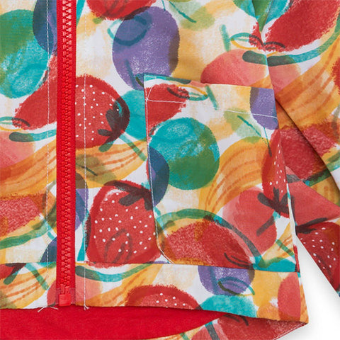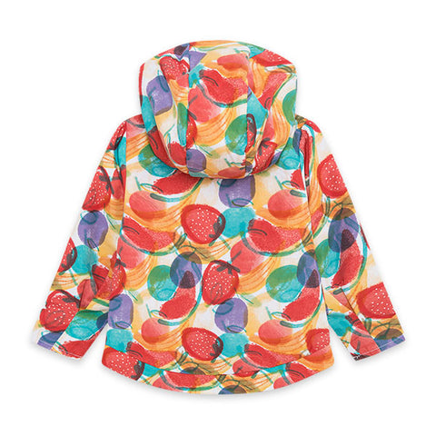 Giubbotto della Linea Abbigliamento Bambina Tuc Tuc, collezione Frutty Time, con chiusura zip e cappuccio, fantasia di frutti colorati all over.