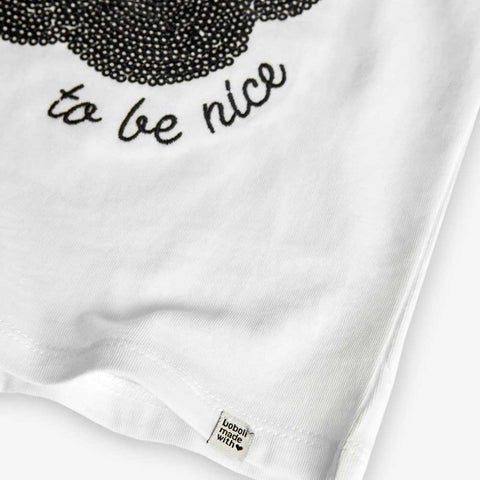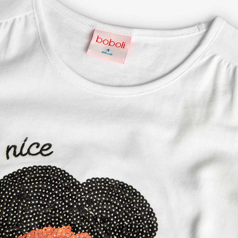 Maglietta della Linea Abbigliamento Bambina Boboli, con applicazione di paillettes a forma di fiore sul davanti.