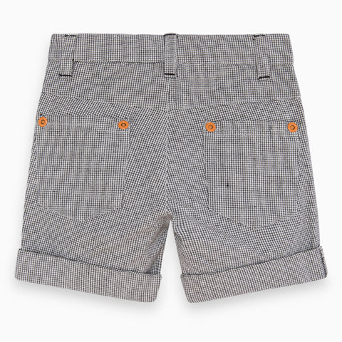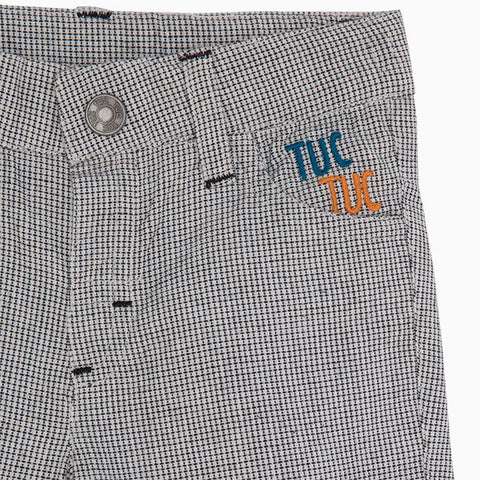 Pantaloncini leggeri della linea abbigliamento bambino Tuc Tuc, con fantasia a quadri e piccole stampe sul fondo. Chiusi con bottoncino e con taschine sul davanti.