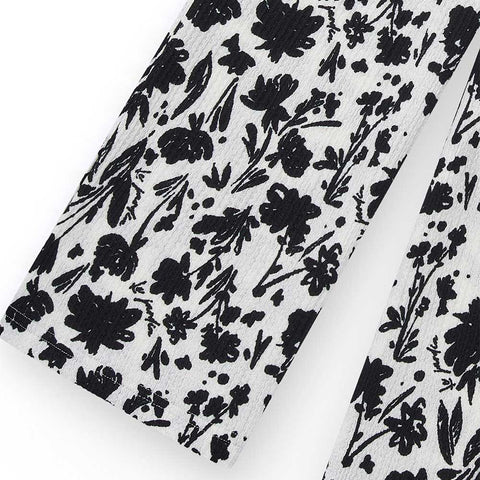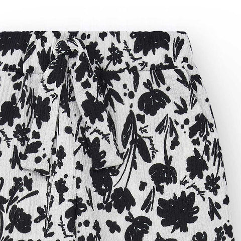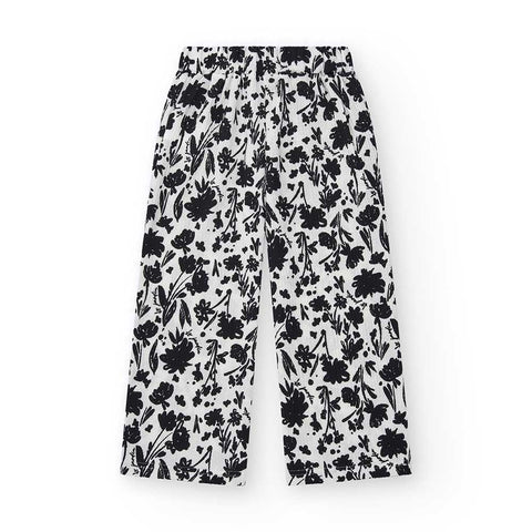 Pantalone largo della Linea Abbigliamento Bambina Nath Kids, con tessuto crepe e fantasia a microfiori neri su fondo bianco.