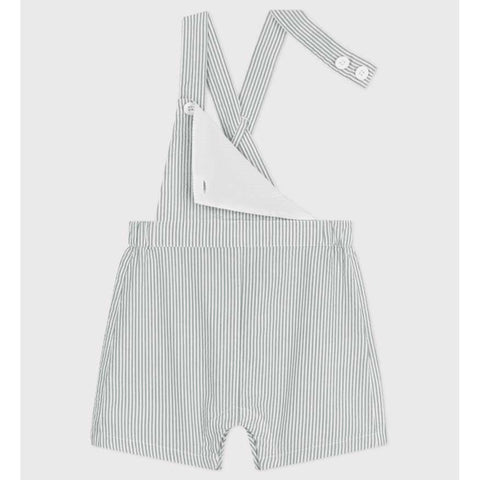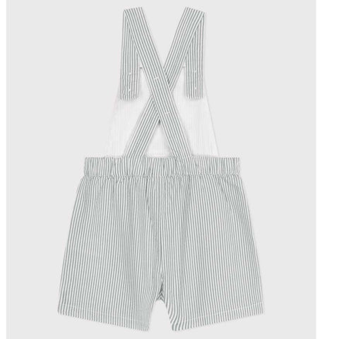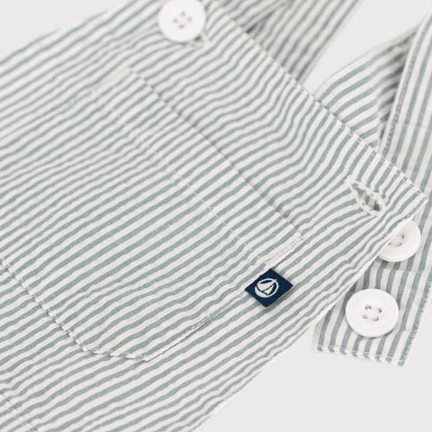 Salopette della Linea Abbigliamento Bambino Petit Bateau in seersucker, un tessuto morbido e piacevole da indossare, dall'aspetto leggermente goffrato.