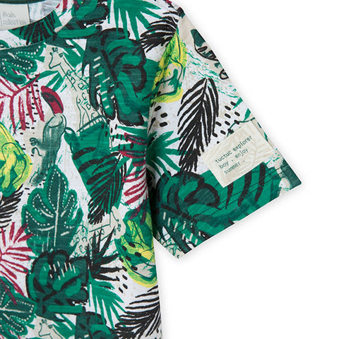 T-shirt della Linea Abbigliamento Tuc Tuc, collezione Jungle Street, con fantasia tropicale all over.